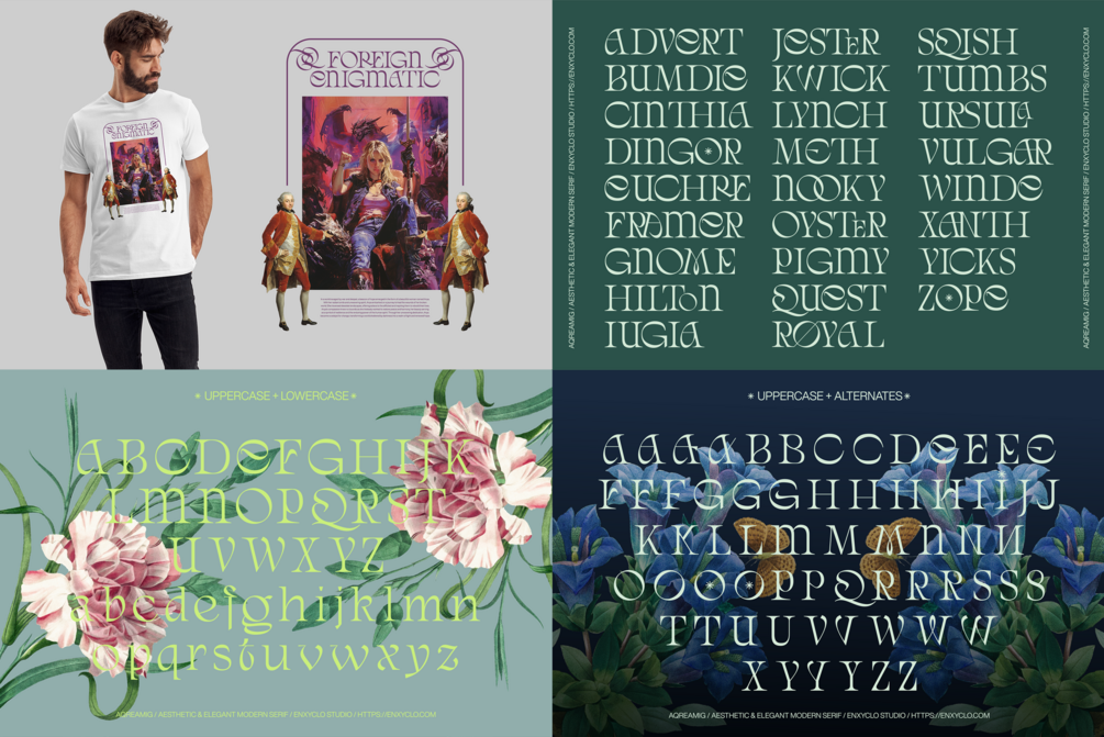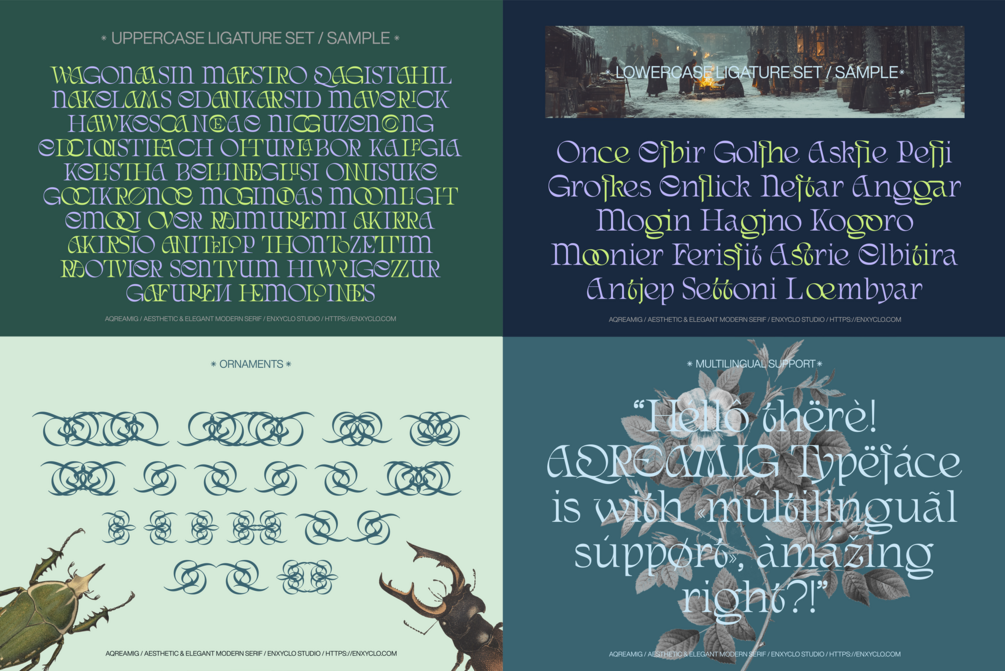 Aqreamig is an aesthetic and elegant modern ligature serif font. Flowing curves with sharp, angular accents, creating a striking balance between futuristic elements and subtle touches of nostalgia. This typeface embodies a classic and nostalgic feel while incorporating modern elements. With its elegant curves and unique variations, this font is perfectly suited for any creative project. It was purposely crafted to be used in large point sizes, although it doesn’t lose its magic in small point sizes. It is perfect for headline, digital ads, magazines, website, poster, branding, and logos. No matter the topic, this font will be an incredible asset to your fonts’ library, as it has the potential to elevate any creation. With this beautiful font, absolutely you can make your project stand out from the rest.