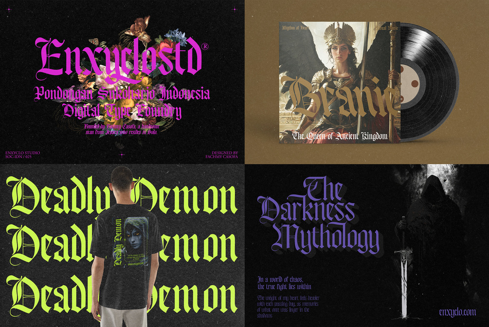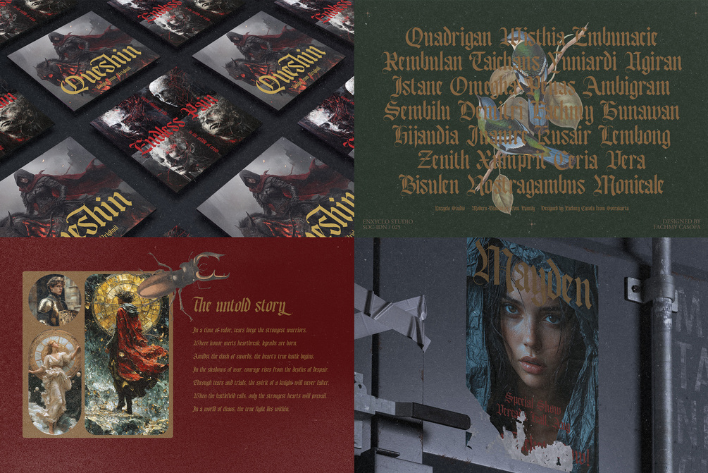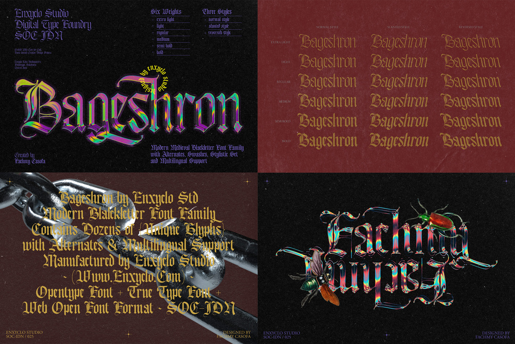 Bageshron is a modern medieval blackletter font family. The letters are inspired from the middle ages with a blackletter style but have modern touch. Very suitable for creative projects that have a medieval theme or contemporary designs but have a modern-classic touch. Its modern aesthetics bring a whole new dimension to your designs, making them stand out. Whether you’re working on a website, poster, logo, or any other project, this font adds that extra touch of innovation and sophistication.