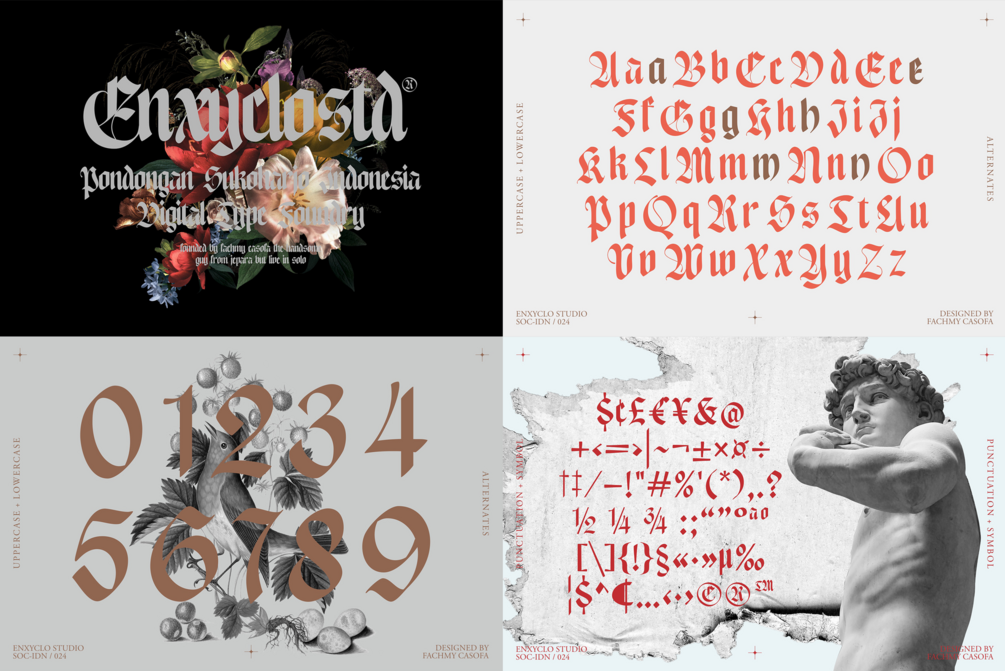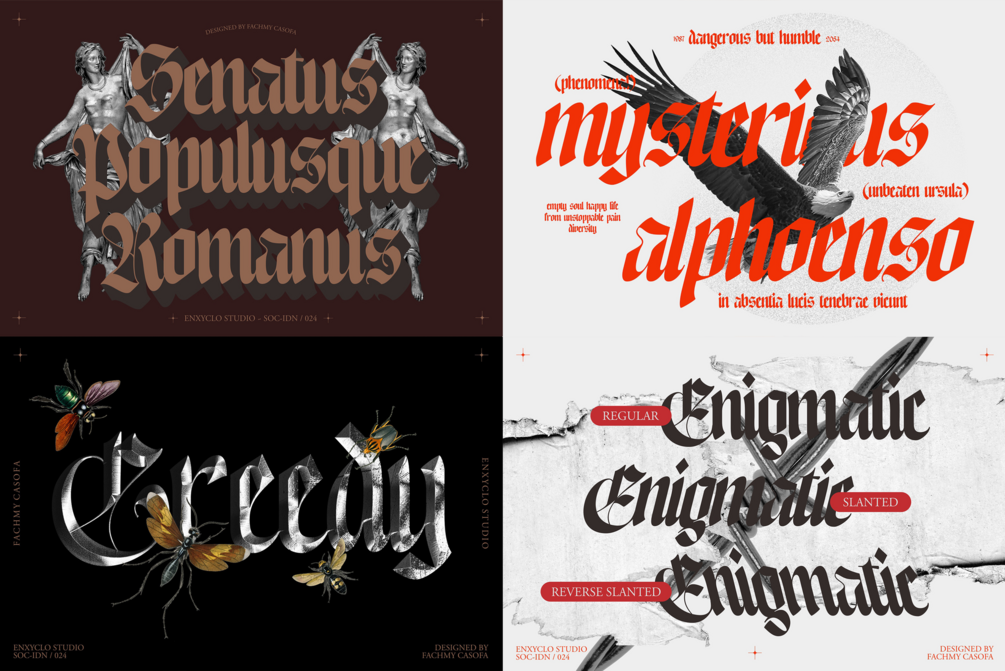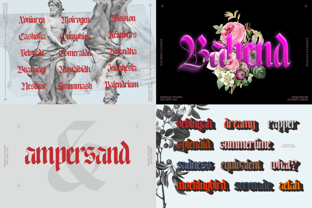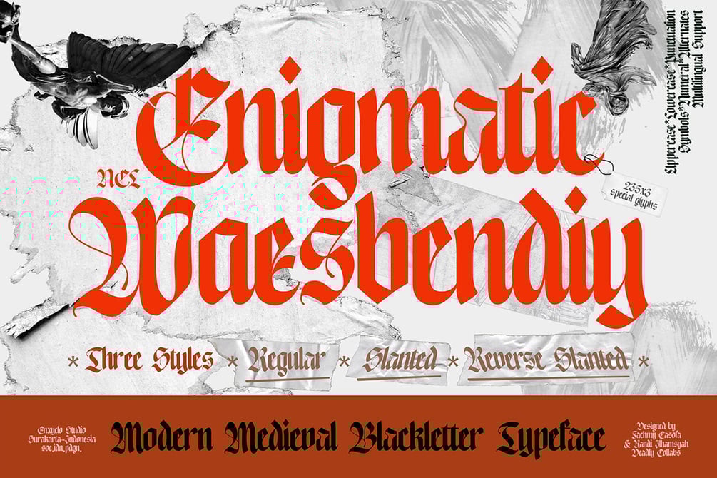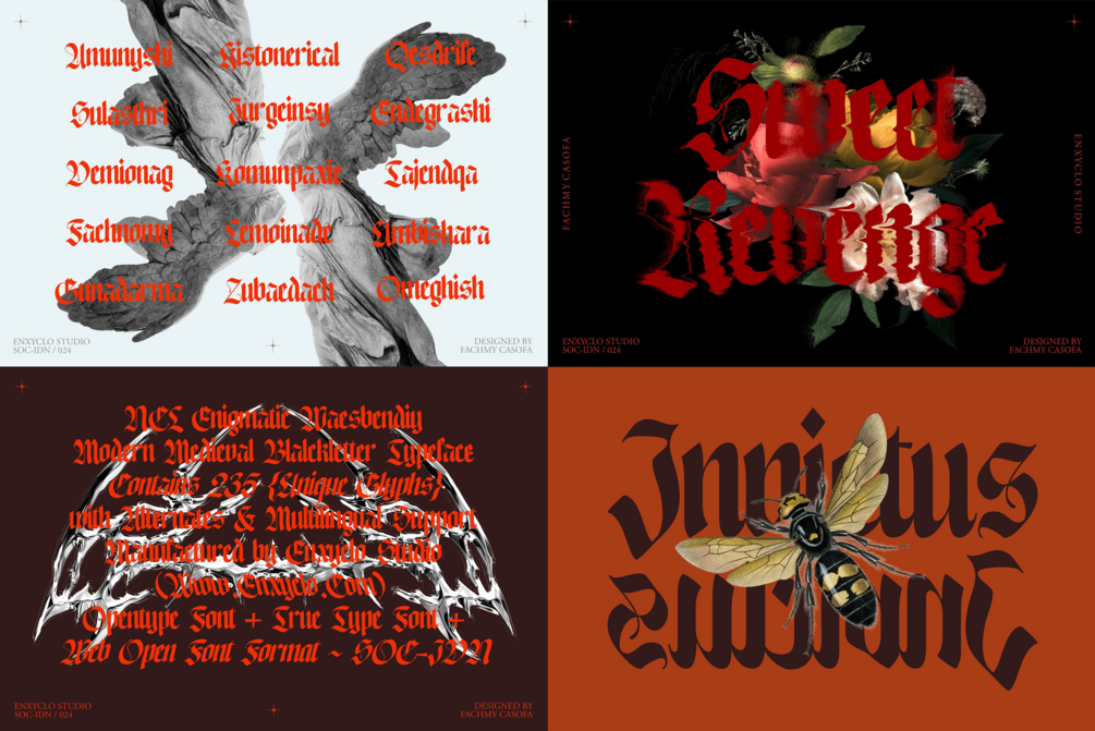 NCL Enigmatic Waesbendiy is a modern medieval blackletter font. The letters are inspired from the middle ages with a blackletter style but have modern touch. Very suitable for creative projects that have a medieval theme or contemporary designs but have a modern-classic touch. Its modern aesthetics bring a whole new dimension to your designs, making them stand out. Whether you’re working on a website, poster, logo, or any other project, this font adds that extra touch of innovation and sophistication.