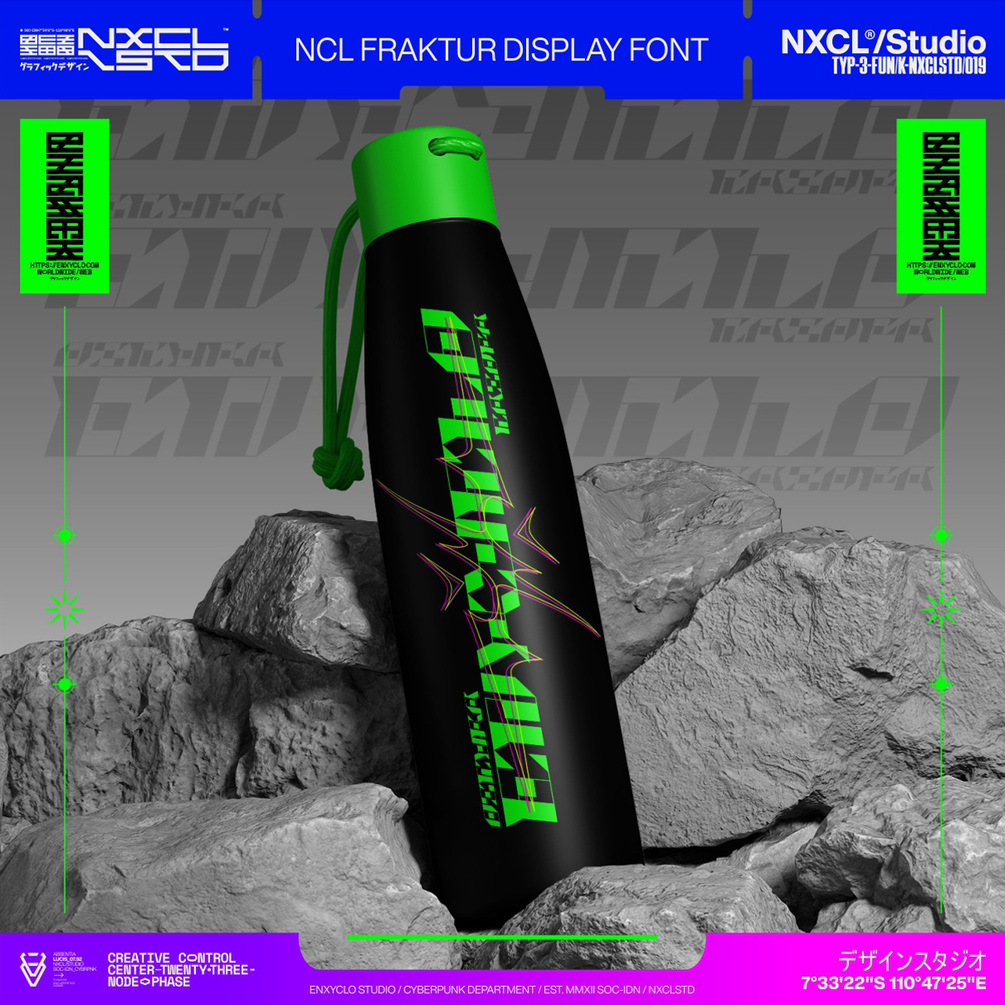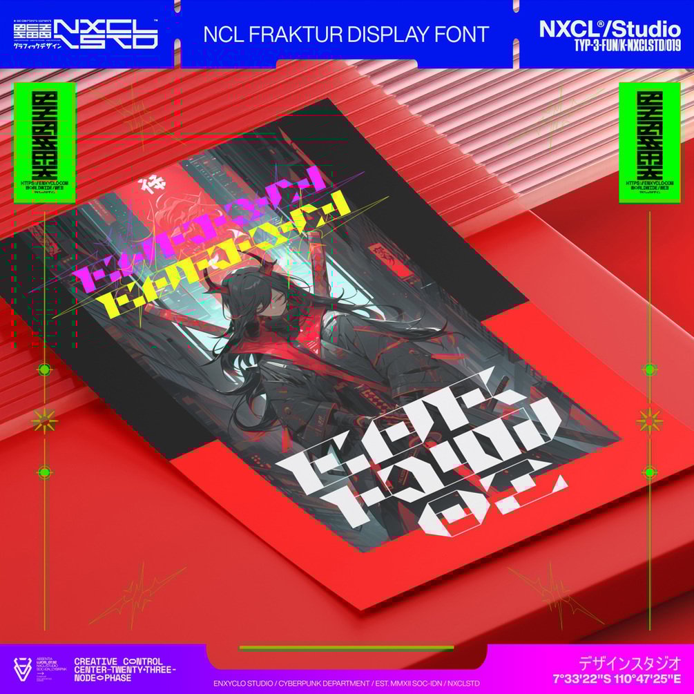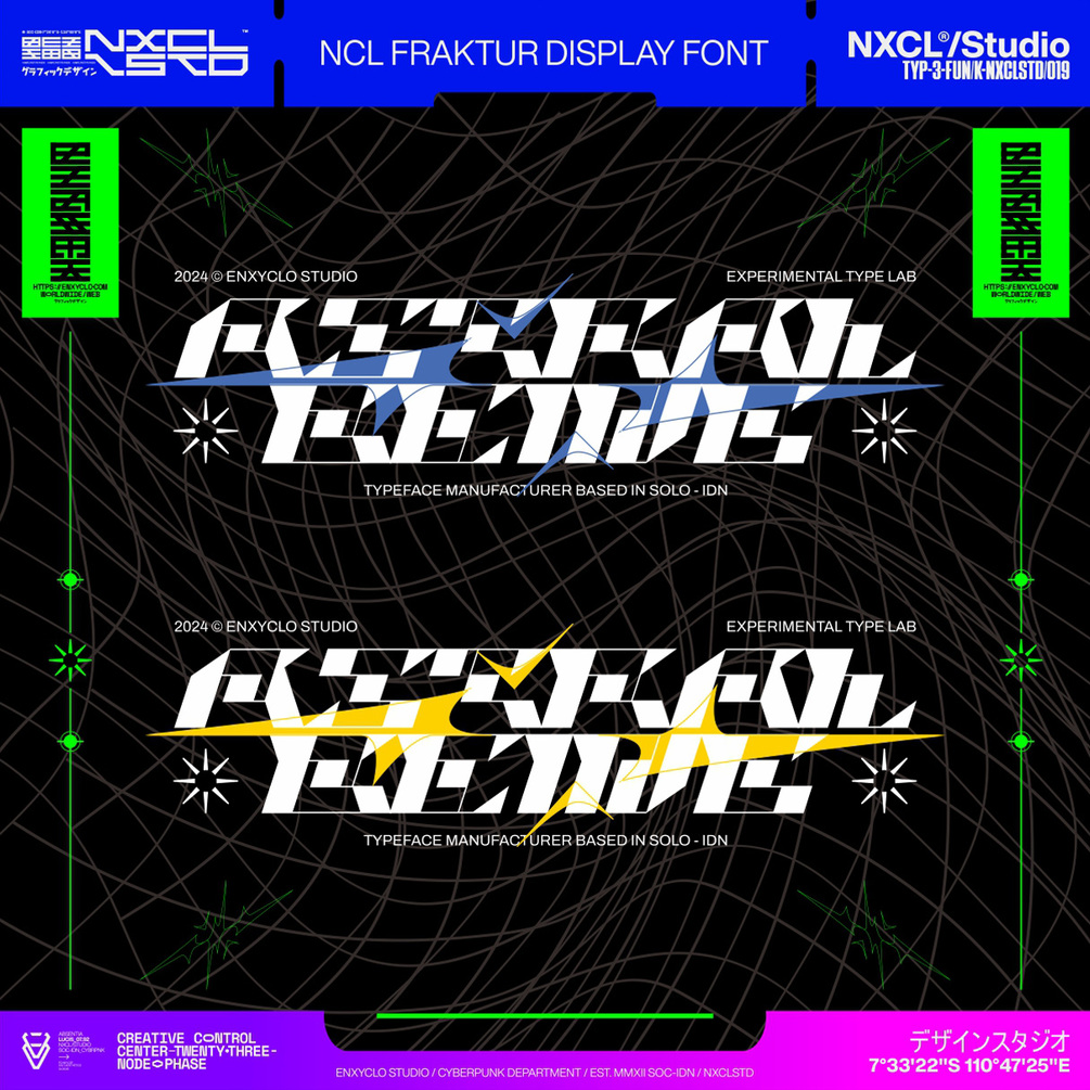 NCL FRAKTUR is the ultimate futuristic y2k cyberpunk mecha industrial typeface. With sharp, angular shapes on all sides, it gives off a strong futuristic vibe. The contrasting thick and thin lines of its stem make it both unique and timeless, perfect for both modern and classic designs with a futuristic touch. This stunning and powerful font cuts through the noise, bringing a bold industrial edge to your designs. With its sleek and futuristic design, this font is perfect for any futuristic or cyberpunk design, album artwork, posters, headlines, and logotypes. Add this font to your design toolkit today and unleash the cutting-edge style of this versatile font.
